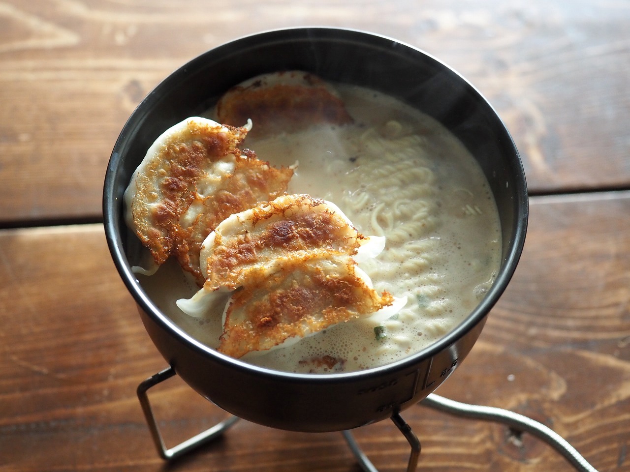 途中で餃子を入れます。餃子がカチンコチンなら麵と一緒のタイミングで、冷たければ1分後、常温なら2分後に入れる。山なら完全解凍と思いますので、2分後ですね。