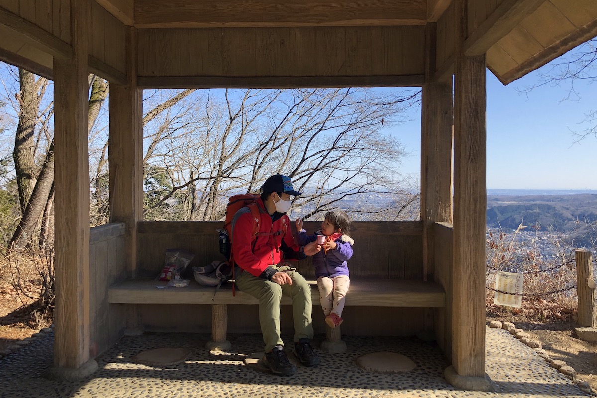 矢倉台から見渡せる青梅市の眺望は気持ちがいい。ちょうど休憩所があるので「がんばったからごほうび!」と、またおやつタイム。