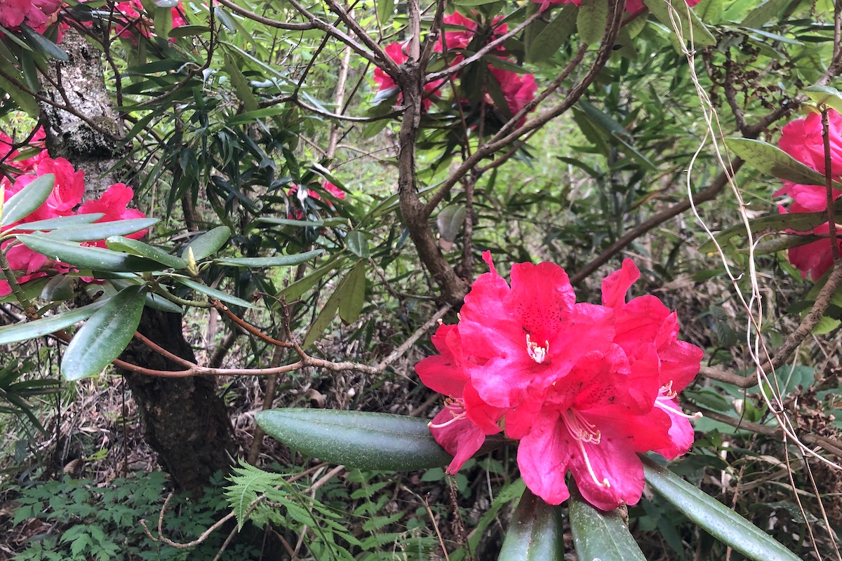 山頂では真っ赤なシャクナゲが満開だった。季節の移り変わりを肌で感じて、楽しんで欲しい。