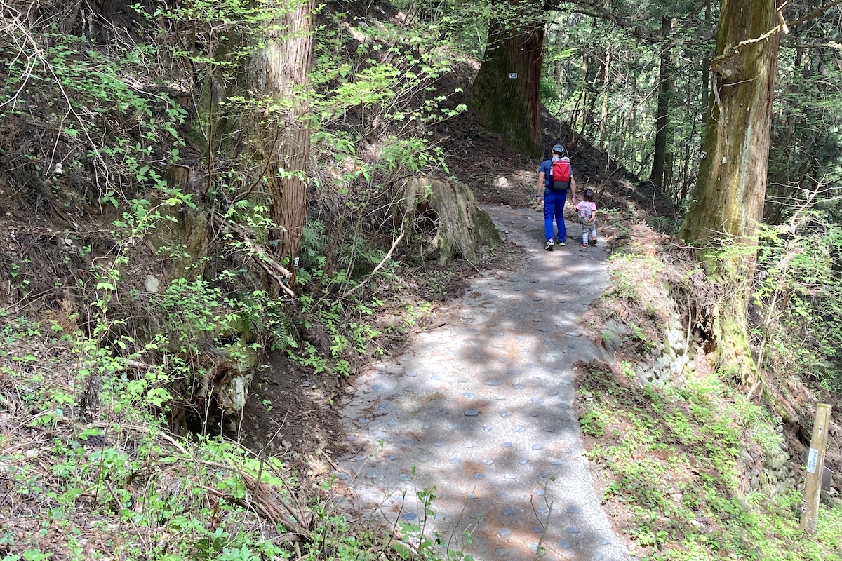 この、つづら折りになっている単調な道が山頂まで続くことになるので、いつも以上に子どもが歩くことを飽きないようにする工夫が必要だ。