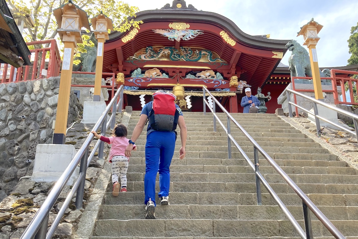 最後の難所は山頂の武蔵御嶽神社の長い階段だ。かなり急になっていて段差もあるので、3歳児の短い脚では一段一段登るだけでかなりハードな全身運動になる。少し心が折れそうになるも、途中にある休憩椅子に腰掛け、おやつでエネルギー補給し気持ちを立て直し再スタート。