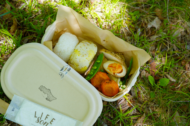 今回のイベントの楽しみのひとつ「特製ランチボックス」。メインシェフの緑川さんは、2019の夏、アメリカ国立公園ヨセミテから始まる「JMT(ジョン ミューア トレイル)」を約1ヶ月かけて歩いた経験もある、登山やトレッキングなどを自然を愛する料理人。今回用意していただいたランチボックスの蓋を開けると “ドドーン” と、おにぎりがふたつとゆでたまご。鮮やかな野菜のグリルや鶏ハムなど、ボリューム満点! お腹いっぱい&元気いっぱいになりました!!