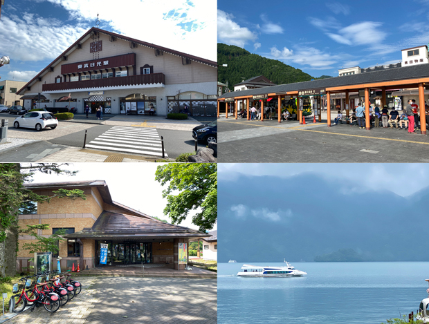 (上)公共交通機関を利用して、アクセスしやすいのも魅力。JRと東武日光駅にあるバス停からは、中禅寺湖で、華厳の滝や県立日光自然博物館に向かう「中禅寺温泉行き」と、中禅寺湖を経由してさらに奥の「戦場ヶ原」や「湯ノ湖・湯滝」に向かう「湯元温泉行き」がある。東武日光駅内に案内所があるので、相談してチケットを購入するのもよいでしょう。(下)日光自然博物館の入口に、サイクルシェアがある。中禅寺湖の観光案内・交通手段などは、コチラ。