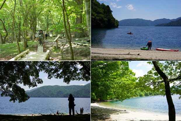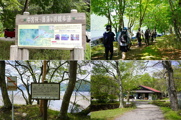「千手ヶ浜」から先のプランはいくつかあったようですが、帰りは同じ道を引き返すことになりました。行きに歩いた道をのんびりと湖畔の景色を楽しみながら、また戻ります。往路の途中で印象的だった場所で写真を撮ったり、小休止したりと、歩かないとわからなかった魅力的な場所を改めて堪能することができました。