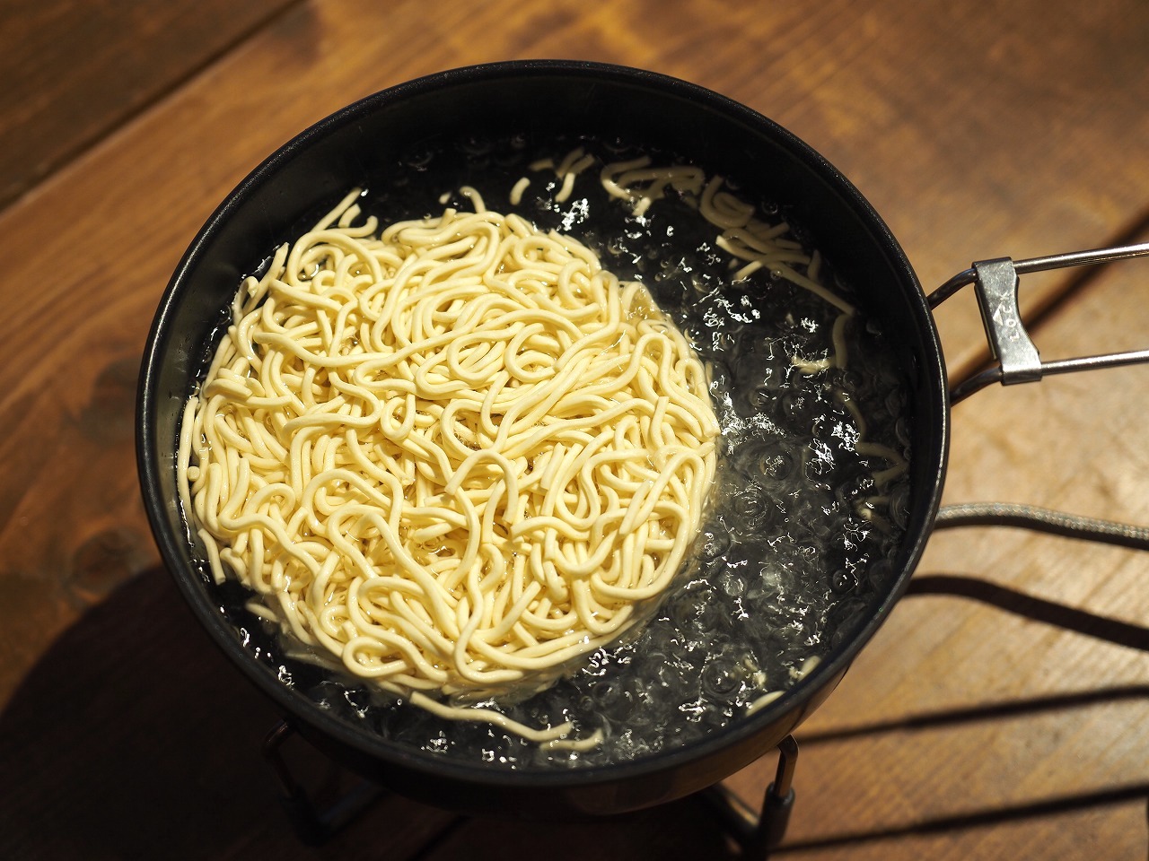 で、麺を入れて煮込む。まぁ、普通です。今回はスープを2種入れるので水の量は少なめにしない方がイイですよ。多めにすることはないけどね。