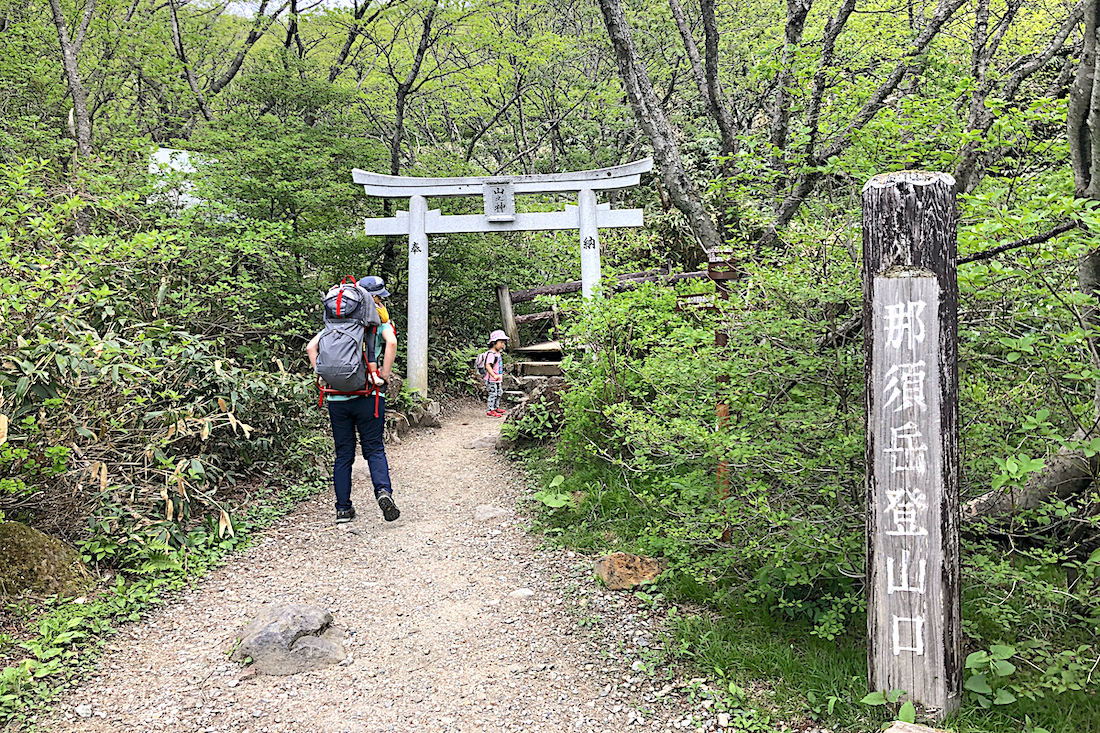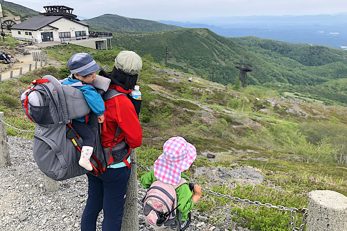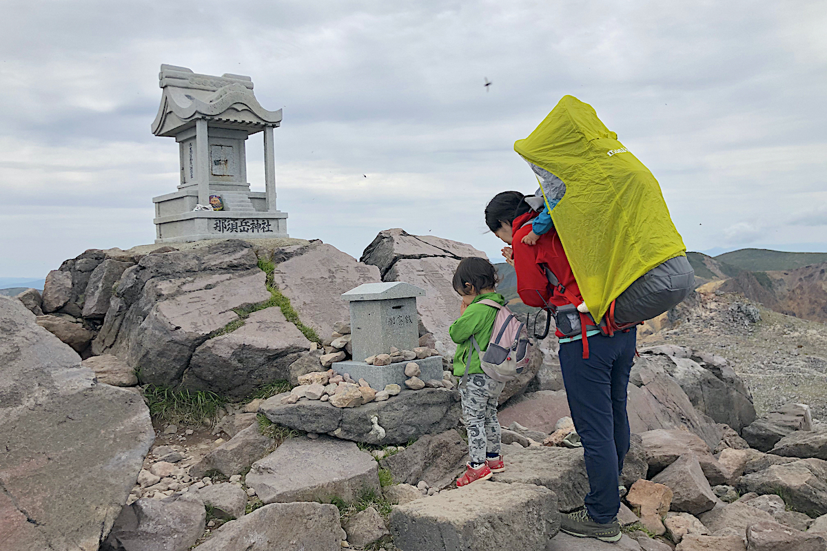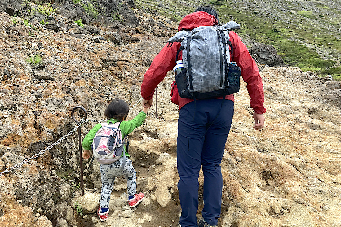 すでに親も娘もだいぶ疲れていたが、コースはまだ半分。残り半分は茶臼岳山頂をめざして、さらにゴロゴロした岩場を直登だ。さすがに「抱っこ……」と言いはじめた娘だが、同い年くらいの女の子がベビーキャリーに担がれているのをみて自尊心に火がついたのか、心を奮い立たせて歩き出す。