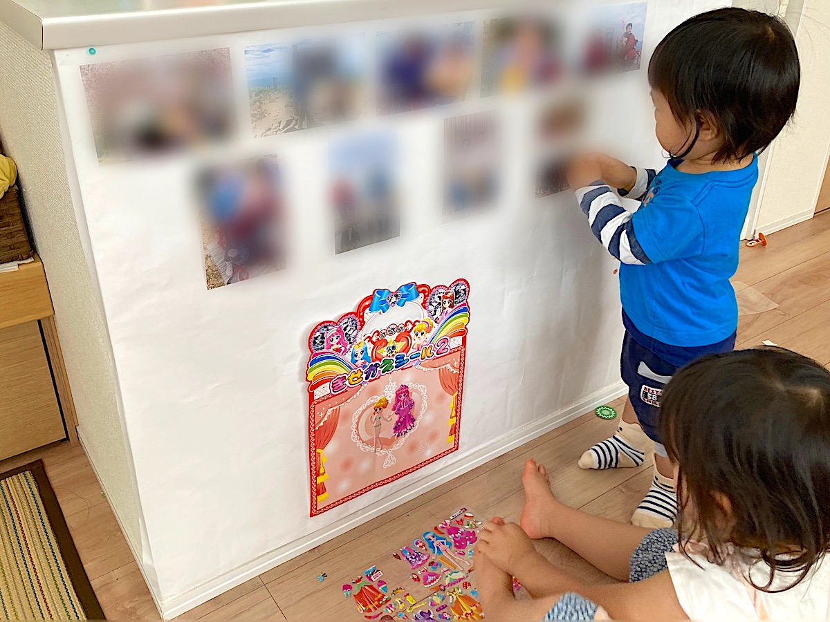 ただ、大事にしたいポイントがある。「子どもの手が届くところ、子どもの目線に写真を飾る」ということだ。家族写真をリビングに飾っている家庭は多いと思う。しかし、写真立てにいれて飾ったり、コルクボードにピンで貼ったりすると、子どもはわざわざ見上げないと視界に入らない。あげく、子どもがもっと近くで見たくて触ろうとしたりすると、「壊すからダメ」と取り上げてしまったりする。大事なのは、ただリビングを走り回っているときや、積木で遊んでいてふと顔をあげた瞬間に、自然と子どもの視界に入ることだ。