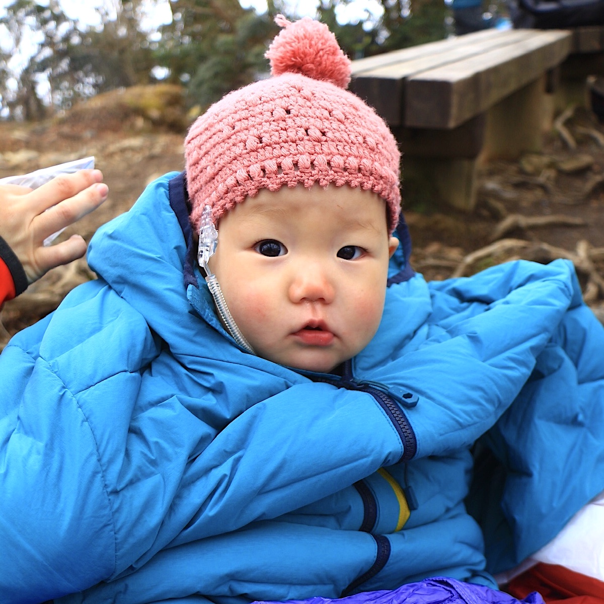 親子登山をはじめたばかりのころ、動かない娘の冷えが想像以上で、もってきた子ども用の防寒着だけでは足りず、親のダウンでグルグル巻きにしたこともあった。