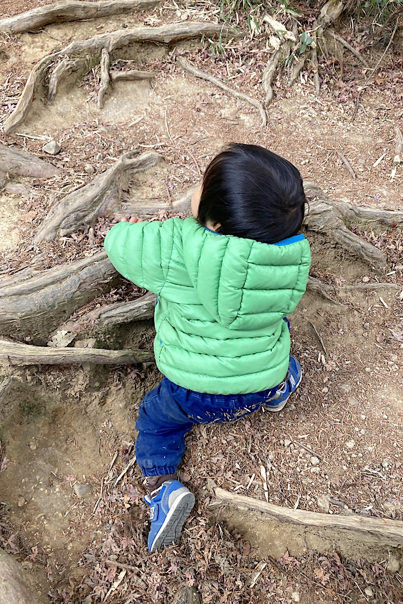 身支度を整え、駐車場をスタートしたのが10時30分ごろ。まだまだ歩行バランスが悪い上に、三歩進んではしゃがみ込む息子を連れていると、登山道入口の鳥居にたどり着くまでに、すでに20分近くたってしまう。