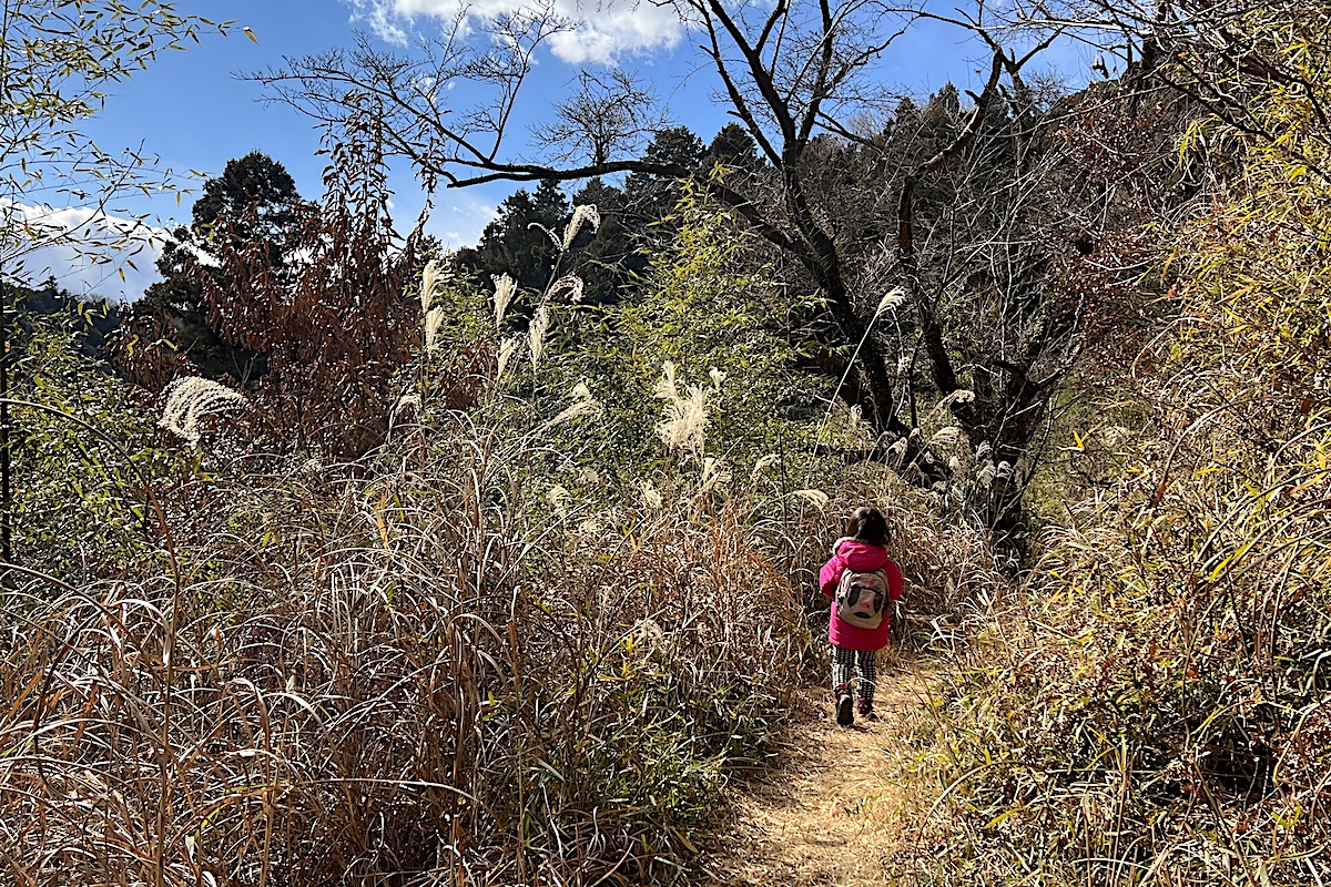 登山道自体は登り一辺倒だが、とくに危険箇所や急勾配もなく、かといって整備されすぎているわけでもなく、はじめて自分で歩く息子にはぴったり。樹林帯を歩いていくので、眺望がのぞめない代わりに、風の冷たさは気にならない。