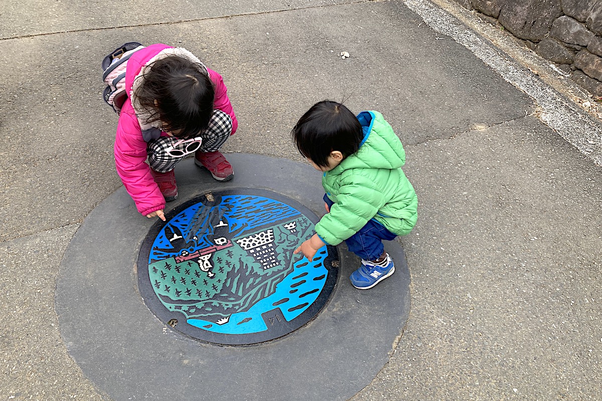 マンホールの絵柄に興味津々で、ふたりで座り込み動かない。ここで先を急いで抱き抱えるか、じっと待つか、親の忍耐力の見せ所である。