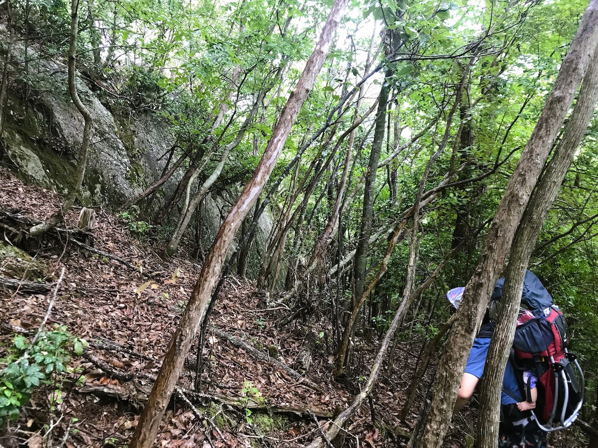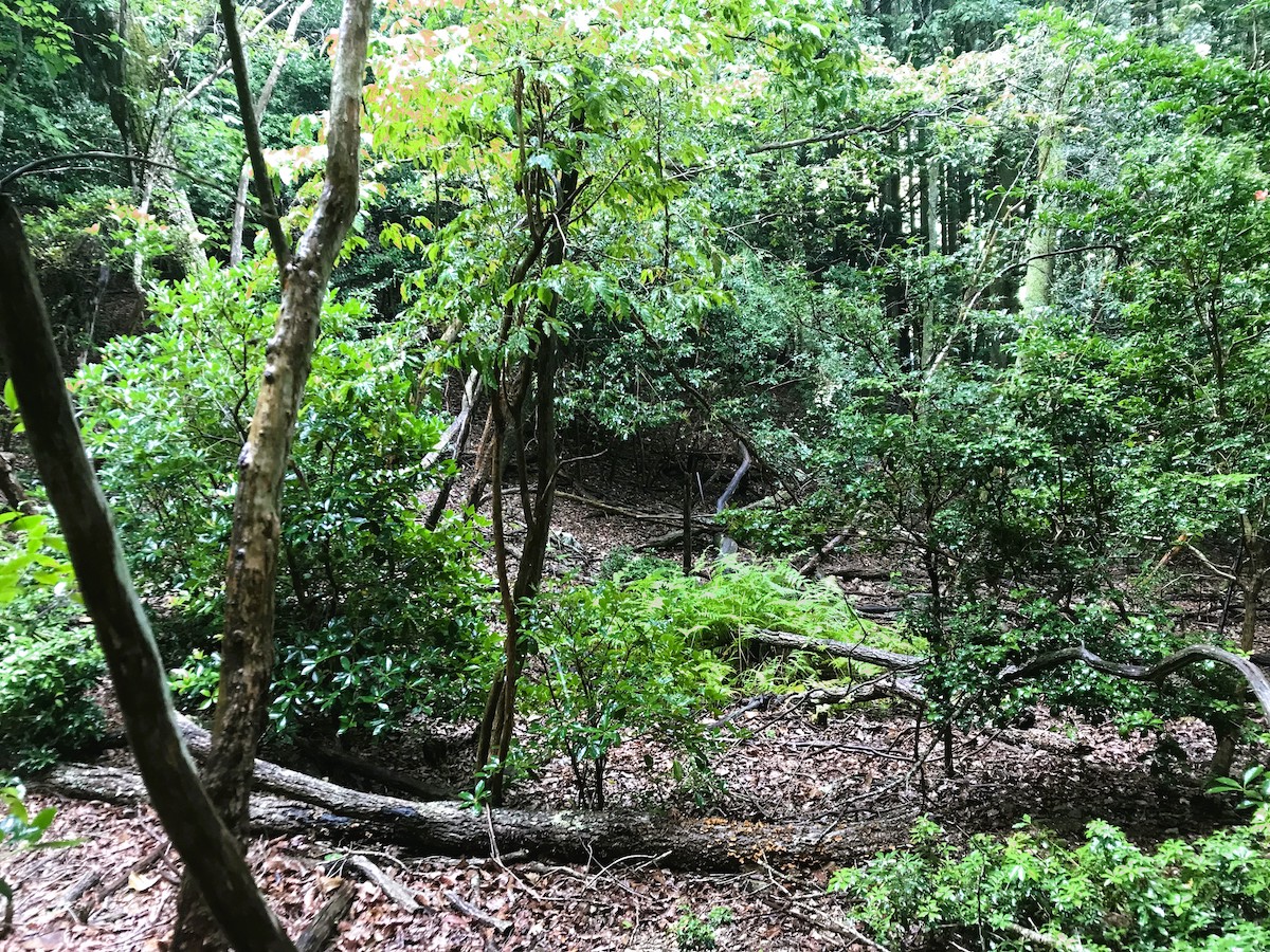当日、曇天であったこともあるが、裏山に入った印象は「うっそうとした暗い森」であった。足元には灌木や雑草が生い茂り、枯れ木が無造作に倒れ、枝は伸び放題。また、長らく人が立ち入っていないことから、もともとあったであろう道もわずかに痕跡があるのみで、土壌はやわらかく、森の中は歩くのが非常に困難な状態だった。