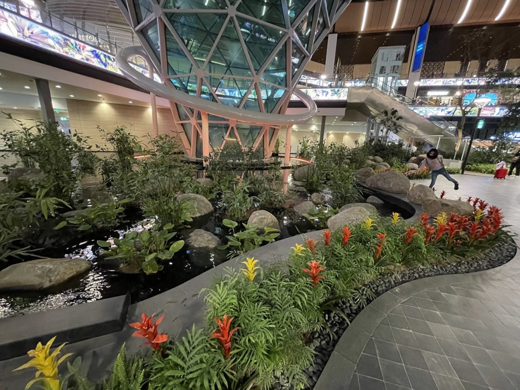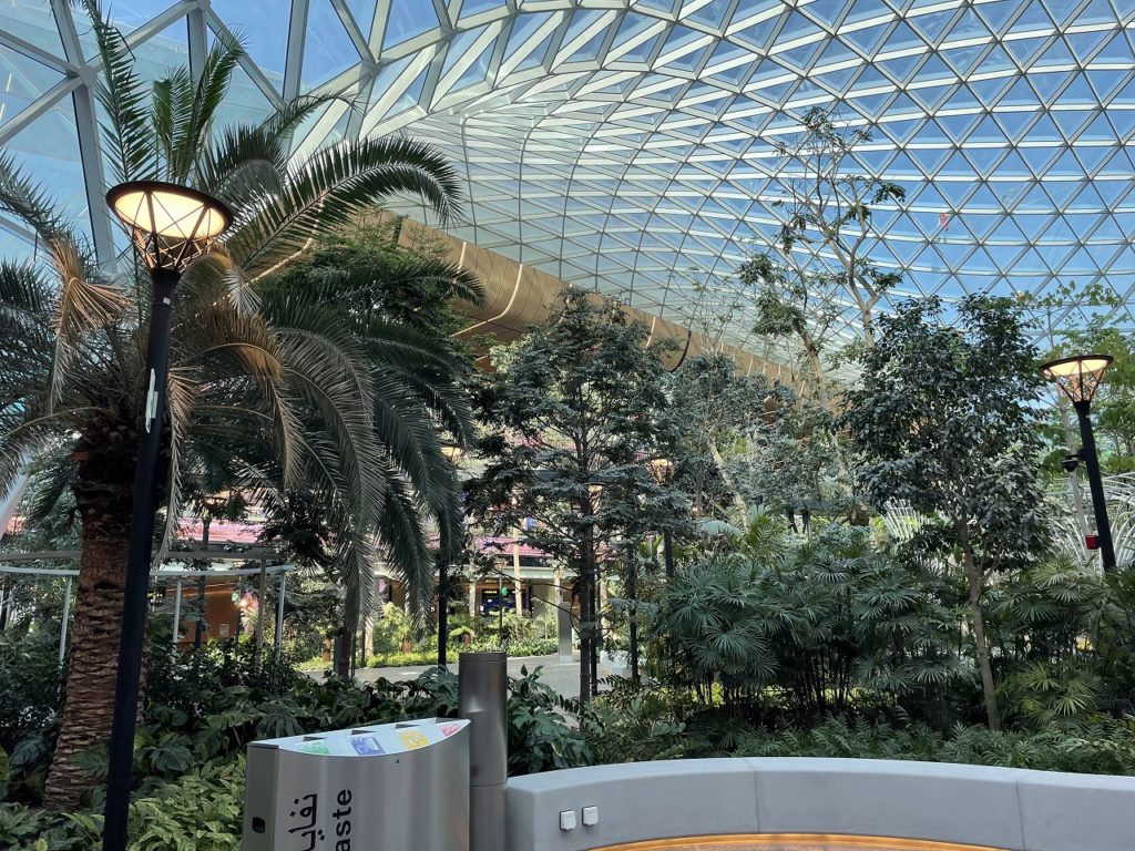 ドーハの空港内の様子。まるで植物園。これが空港内!? と思えるほどナチュラルな雰囲気を漂わせた空間が広がっていた。