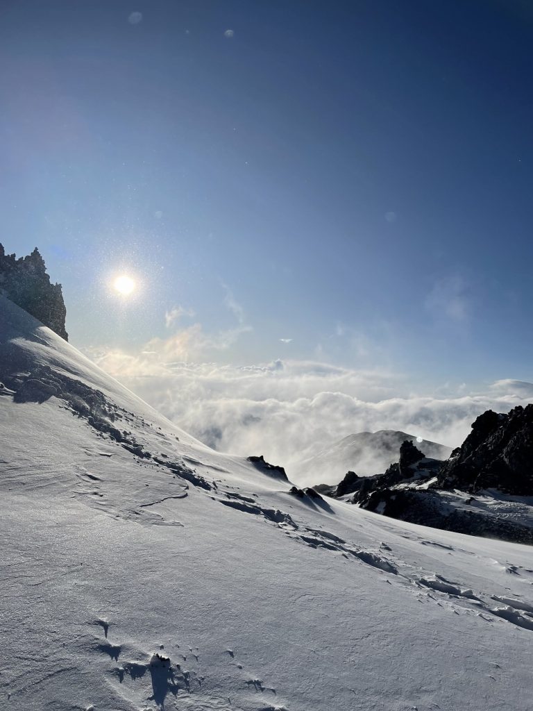 淡々とトラバースを行くと、途中に大きな立岩がある場所に着いた。そこからは先を観察すると、少しずつ傾斜も増し、膝下まで埋まる積雪が残る感じが見える。降ったばかりの柔らかい雪のため、踏み抜きや踏み外しの懸念もあったのでアイゼンの装着具合を確認した。歩きはじめると、案の定、右下が切れ落ちているのっぺりとした斜面で、遠くの下方にベースキャンプが見えていた。足場をミスするとおそらく2,000m下のベースキャンプまで滑落するだろうと容易に想像できる。積雪の状態も風の影響か、5~8cmくらいのウィンドクラストが表面にはあるが、降ったばかりの雪なので内部はかなり柔らかい状態。そこにルートがジグザグと切られているので、いつ雪崩れてもおかしくない状況だった。さすがに通過するのが怖かった。