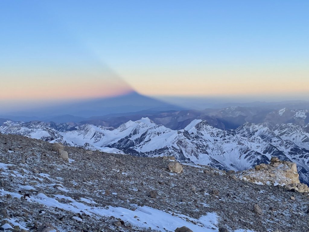 さらに朝陽も上がってきたころ、あたりを見回していると“影アコンカグア”が現れた! 思わず「すごい、すごい! みて、みて!」と口に出していた。ひとりきりであるいていたので、だれかに対して言ったわけではないのだが、今この景色を見ることができるすべての人に気が付いて欲しかった……たぶん、そんな想いが言葉に出てしまっていたのだろう。ふとわれに返って、周りにだれもいないことに落胆し、仕方なく写真に収めた。