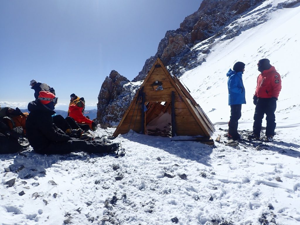 7時45分ごろ、約6,200mのピエドラス・ブランカスといわれる大きな白い岩が目立つ休憩ポイントに到着した。少しだけ立ち止まり、呼吸を整えながら行く先を確認してから、また歩きはじめた。9時45分ごろ、約6,390mにある、インディペンデンシア小屋に着いた。先行パーティーが休憩していた。リーダー風の人がビニール袋に入ったミックスナッツをみんなにひと口ずつ配っていて、近くで休んでいる私にも、どうぞと、同じグループでもないのにわけてくれた。