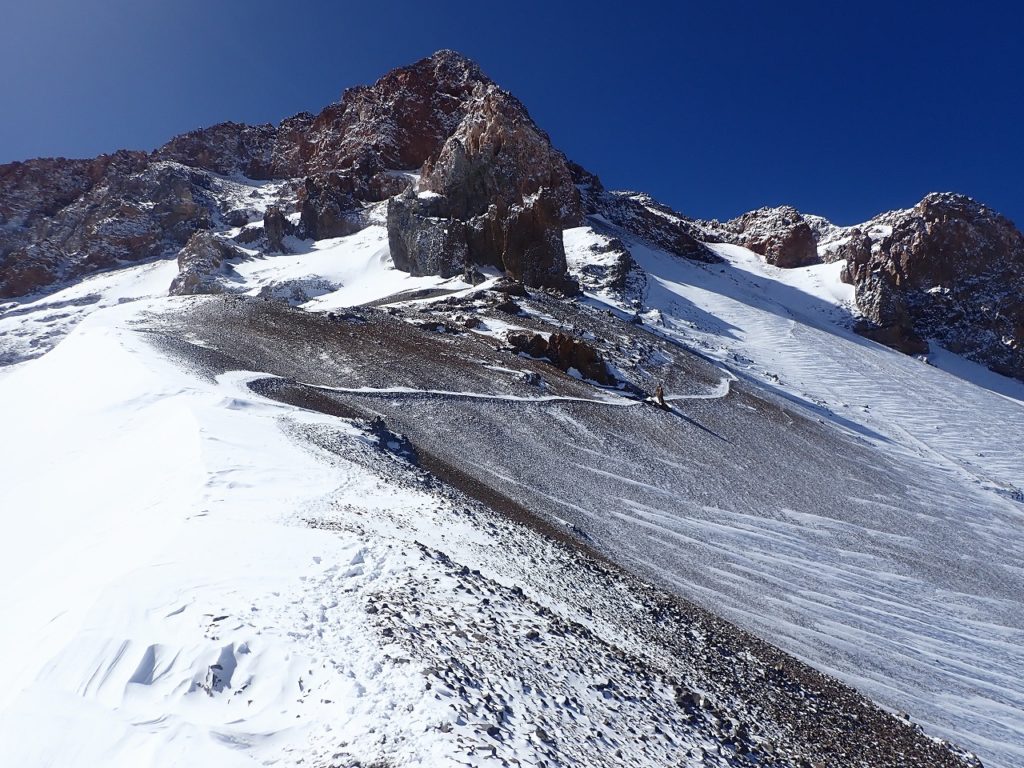 高所のため苦しくてペースを上げることはできないが、なるべく時間を掛けずに進もうと周囲の異変に気を配りながら慎重に進んだ。雪が深く、柔らかい雪で、股関節まで踏み抜いたり、バランスを崩したり、体力と時間をかなりとられた。それでも、12時30分、約6,680mの地点にあるラ・クエバと呼ばれる大岩にやっとのことで到着できた。ここまでが本当に辛かった。なのに、ここからさらにグランカナレーターと呼ばれるところを上がらなくては山頂に到達しない。