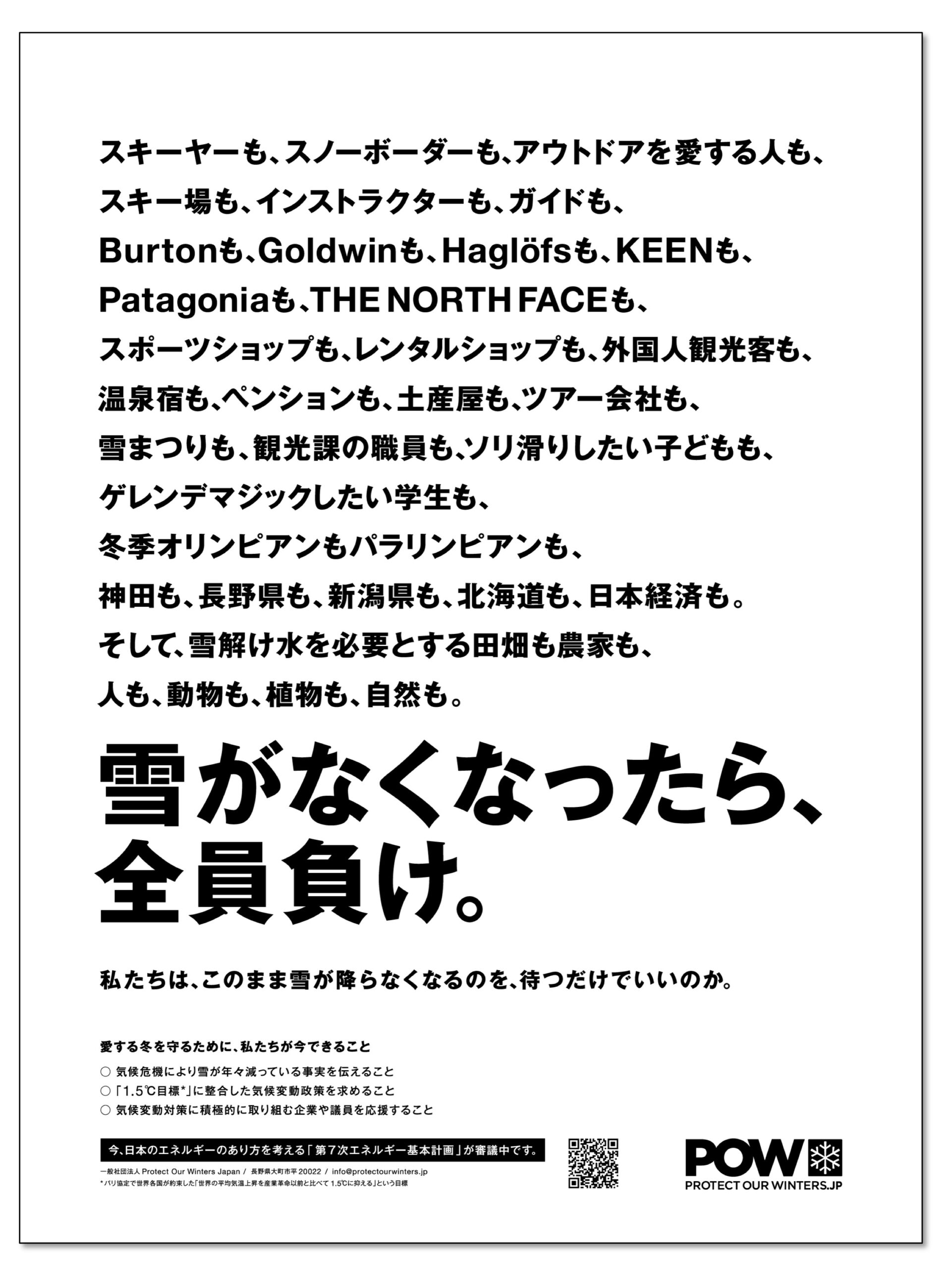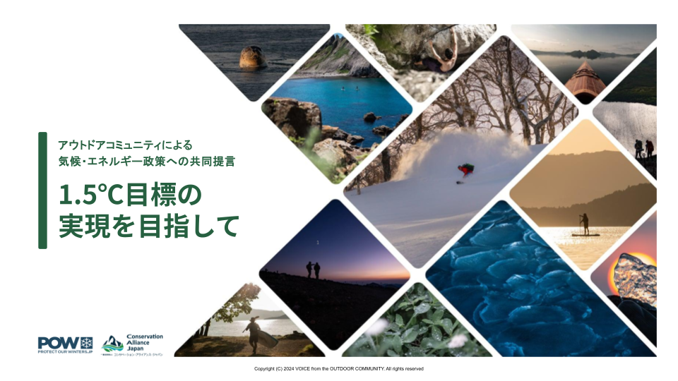 提言書はPOWとアウトドア関連企業が70社近く加盟するコンサベーション・アライアンス・ジャパンとの共同提案であり、提言書の作成には実際に影響を受けている企業や、最前線のフィールドを目の当たりにしているスキーヤーや登山家、研究者からの報告やコメントも掲載され、10月14日現在では149の企業・団体、786の個人やアスリートがこの提言書に賛同している。