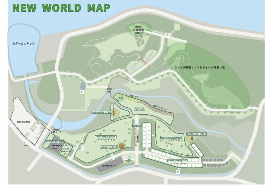 会場の予定図(以降、変更の可能性あり)。涸沼自然公園のオートキャンプ場は快適で人気のサイト。数に限りもあり、売り切れ必至。チケットは早めに抑えることをオススメしたい。