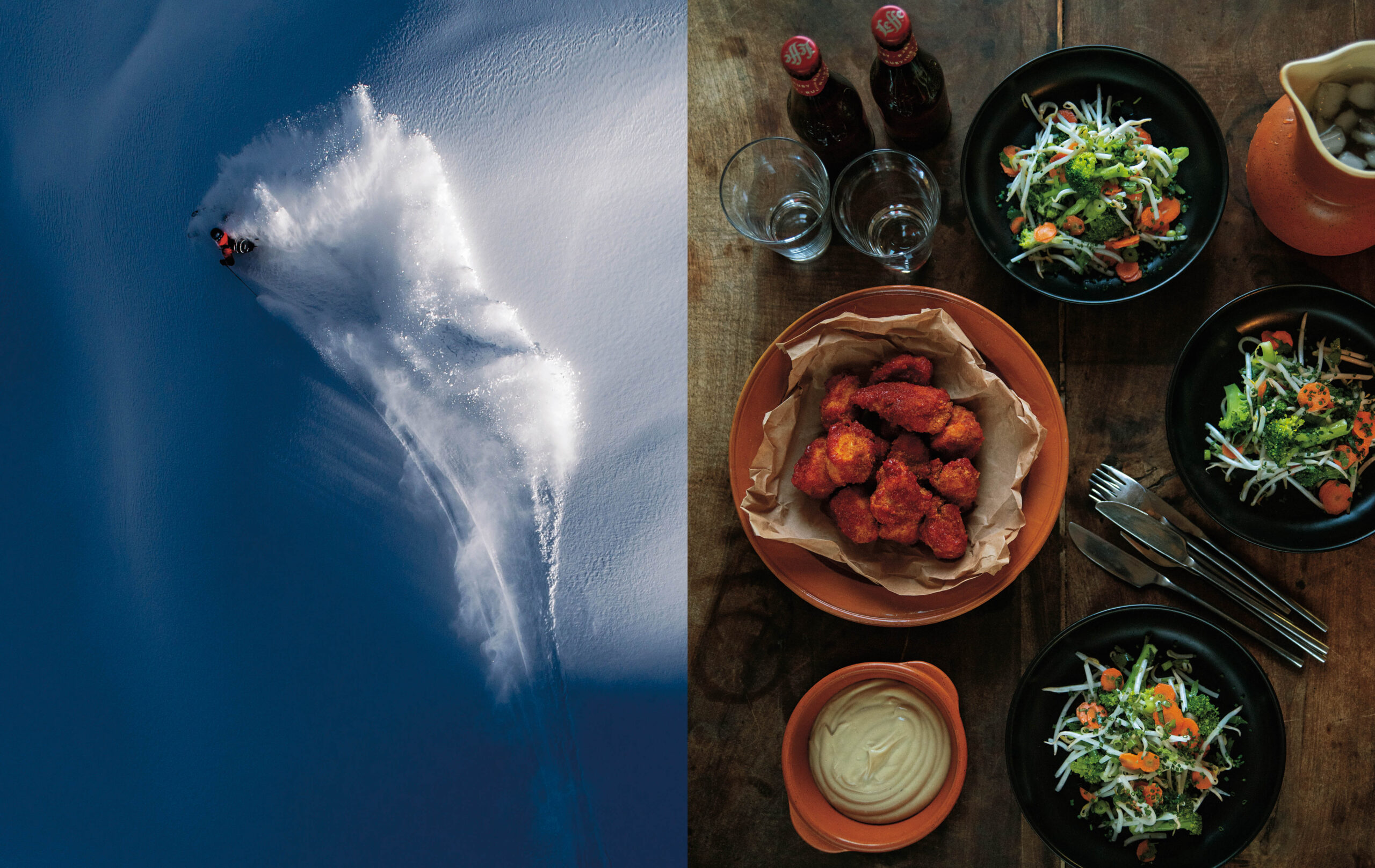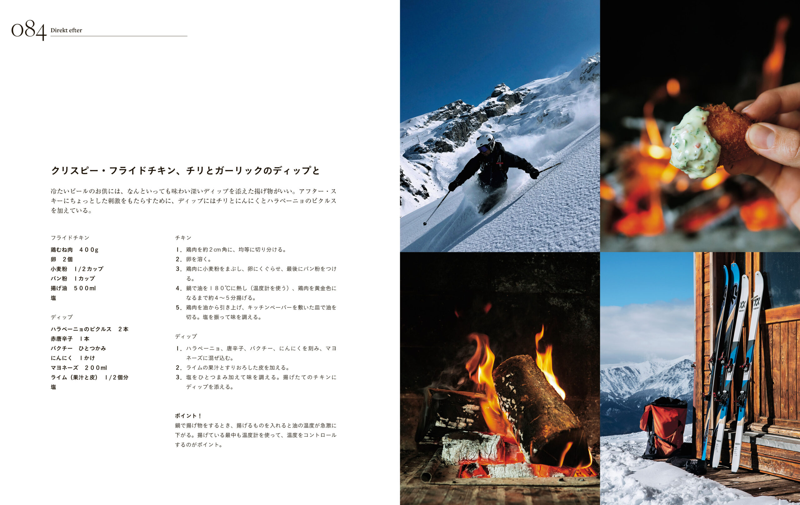 なにより、他の料理本と一線を画すのは、その掲載写真だろう。おいしそうな料理の写真と同じ見開きに、リンドルさん本人や友人が滑るライディング写真や、雄大な雪山の景色が多数並んでいる。